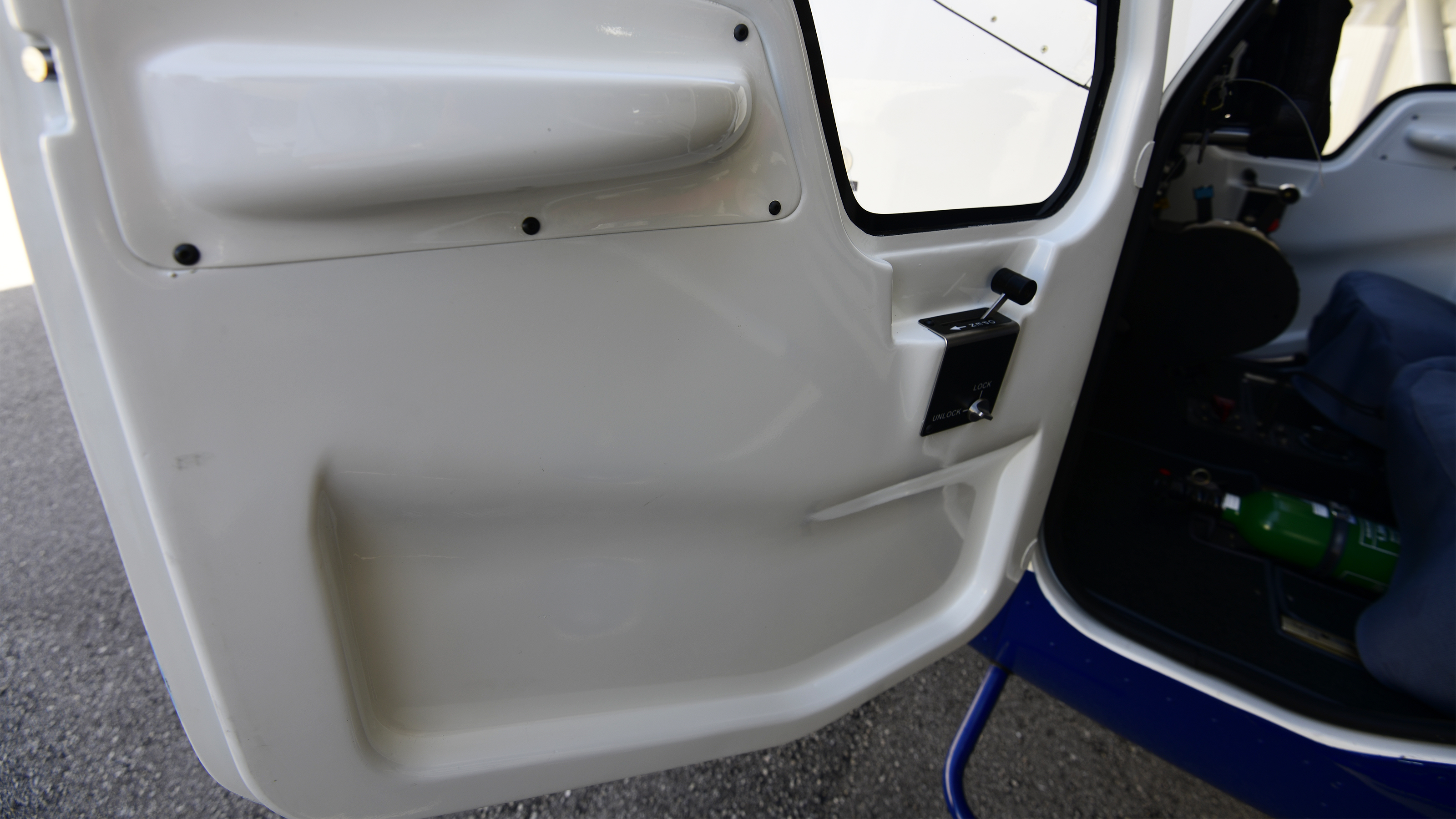 Prior to the flight, the cockpit tube construction provided easy grab handles as we settled into leather-covered seats with grey diamond pattern stitching and blue accents. Interior panels painted bright white matched the outer fuselage color. The absence of fancy upholstery and other niceties signaled the utility and mission of the trainer aircraft.